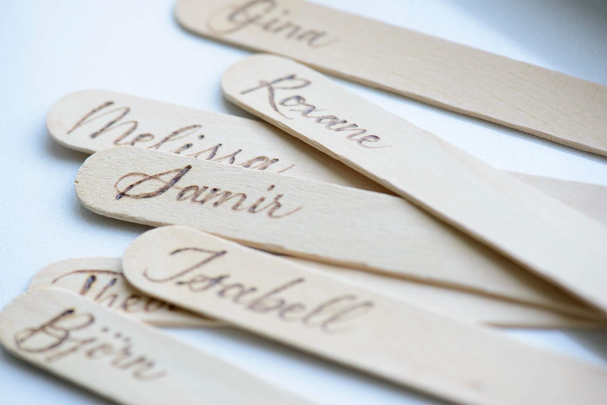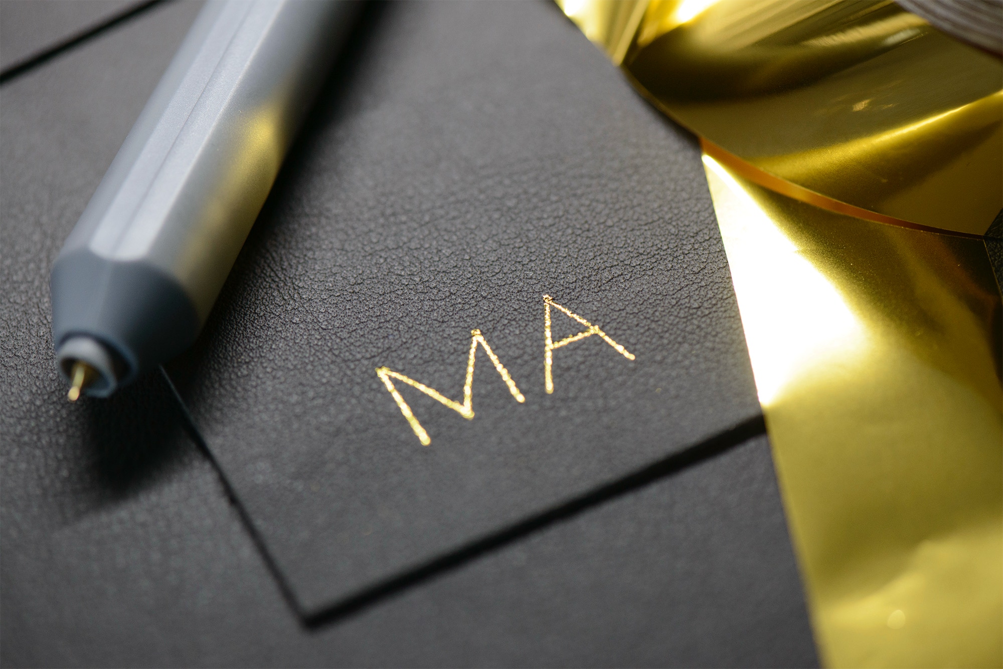 Mit einer kleiner tragbaren Pyrographie Maschine kann die Prägung von Namen, Initialen und kleinen Zeichnungen, wie Blumen, Herzen, etc. direkt vor den Kunden erstellt werden. Die Prägung mit Gold- und Silberfolie gibt dem Produkt einen stilvollen und einzigartigen Finish. Die Prägung auf Leder geht auch ohne Folie (blinde Prägung) und gibt dem Leder eine elegante und dezente Personalisierung.