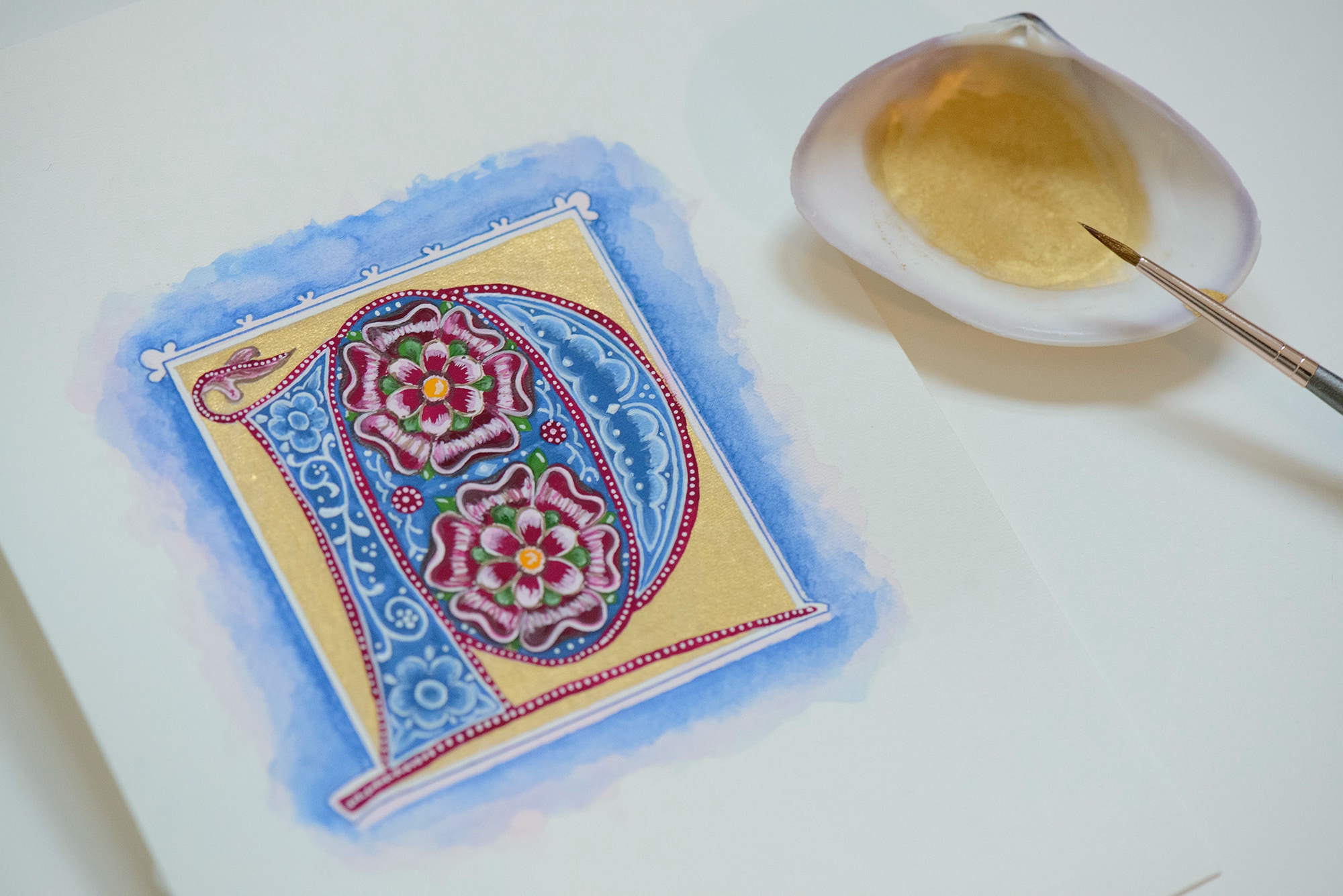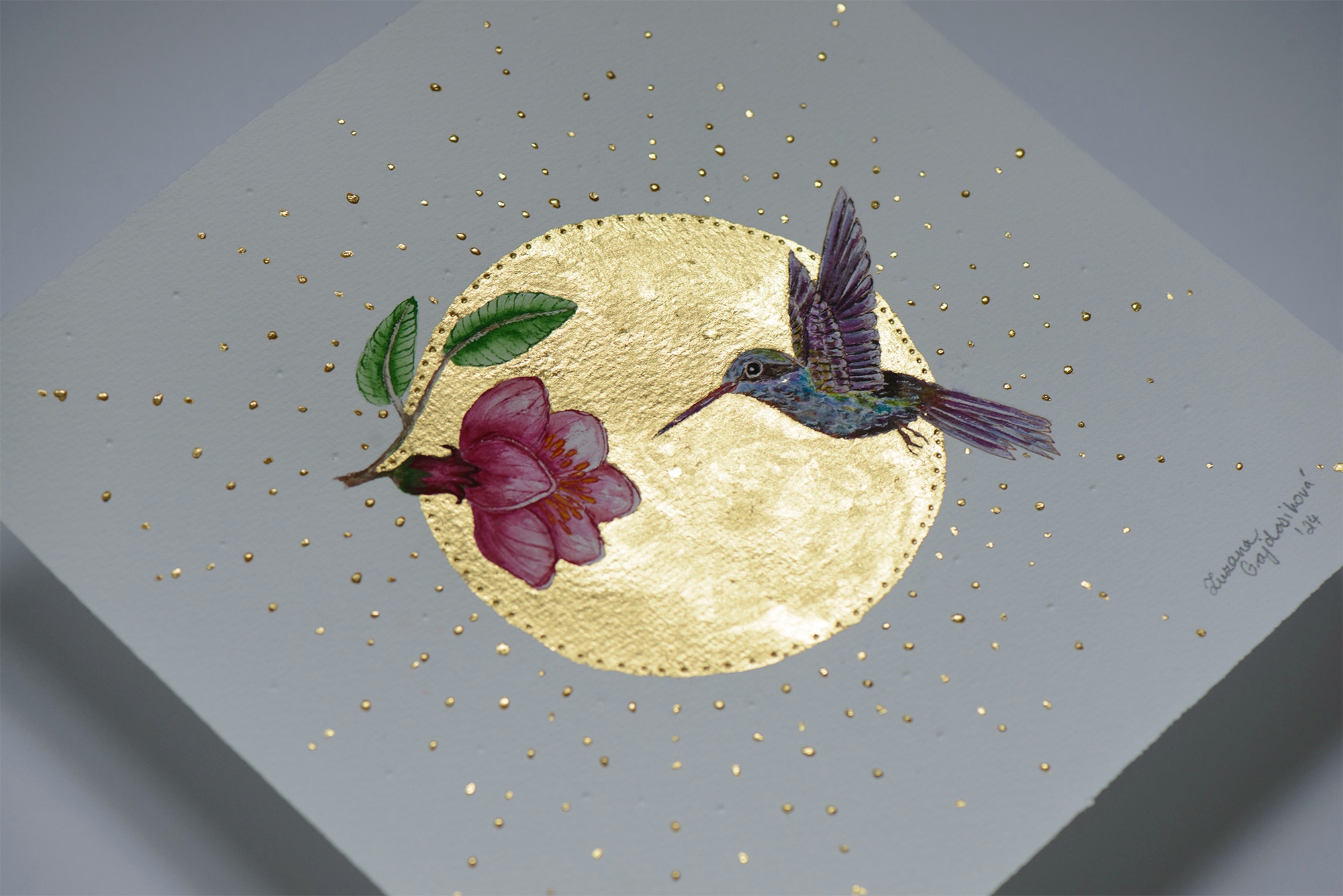 oder mit echtem flüßigen Gold sogenanntem Muschelgold in Kombination mit Kalligraphie oder Illustration verleiht jedem Werk einen wundervollen und edlen Zauber und weckt bei den Betrachter ein Erstaunen und Bewunderung. Je nach Lichteinfall entfaltet das Gold seinen wunderschönen